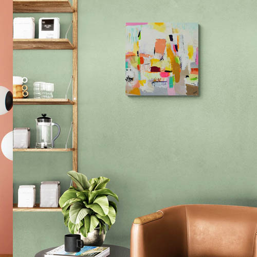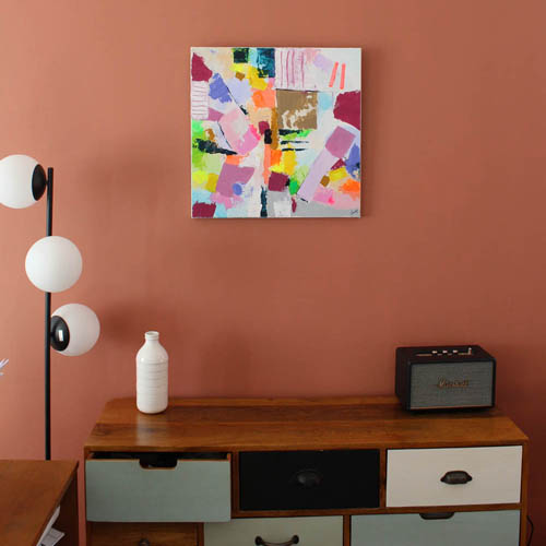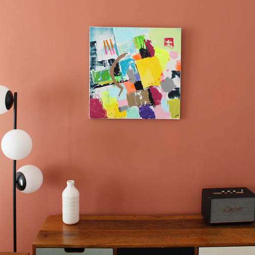 Her vibrant and luminous canvases celebrate life in its simplest and most precious aspects: the small joys of everyday life, suspended moments, fleeting bursts of happiness. Brilliant colors, dynamic forms, and graphic rhythms compose a delightfully dreamlike universe, imbued with a self-assured, childlike gentleness.